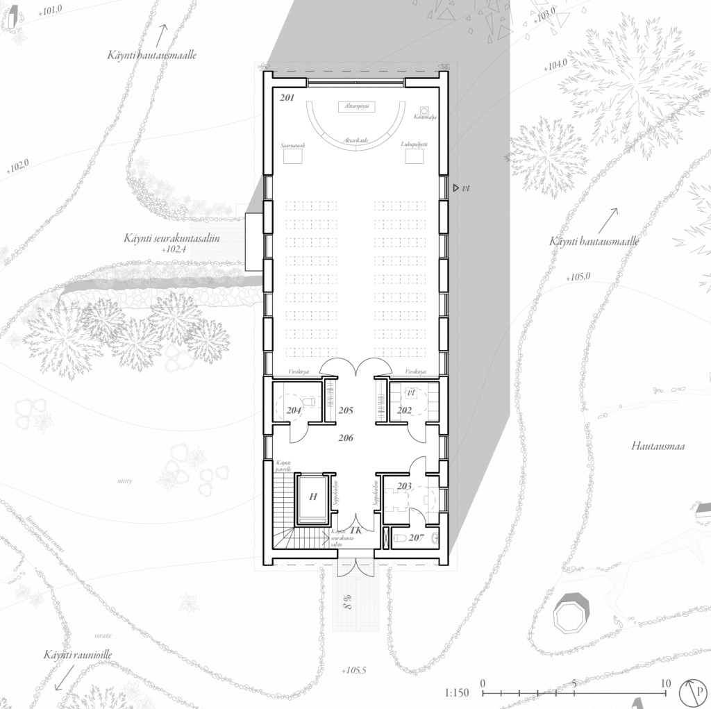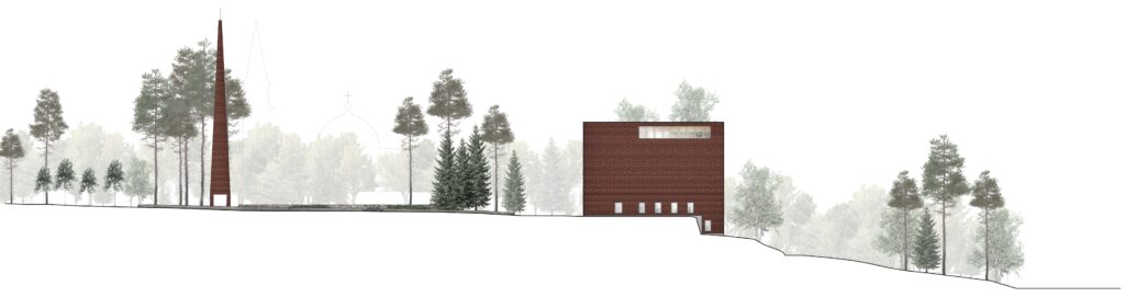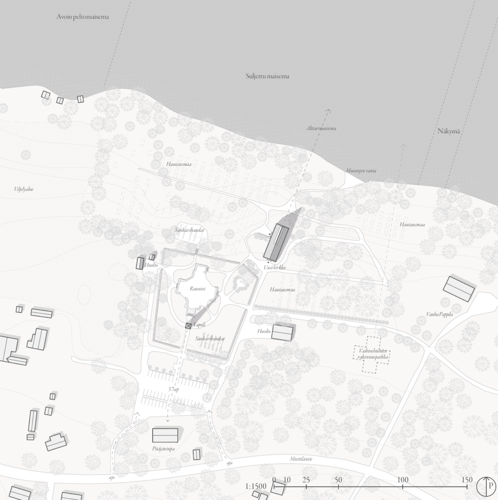 Rautjärven uuden kirkon pääsisäänkäynti asettuu raunioiden ohi kulkevan puistoväylän päätepisteeksi. Suora kulku jatkuu ideologisesti koko rakennuksen läpi, ja se hahmottuu keskeissymmetrisenä pohjaratkaisuna sekä alttaritauluna toimivana järvimaisemana. Uusi kirkko sijoittuu rinteeseen siten, että osa kellarikerroksesta on maan sisällä. Kirkon länsipuoleista polkua loivennetaan, jotta esteetön ulkoreitti seurakuntasaliin on mahdollisimman turvallinen. Katettu sisäänkäynti sijaitsee pitkän rakennuksen keskivaiheilla.